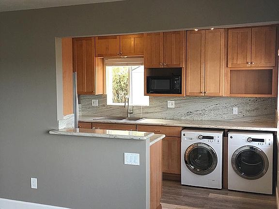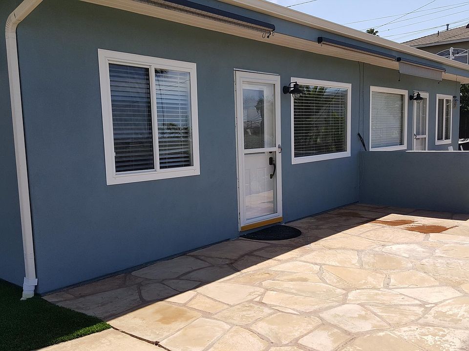 Oceanview/stunning sunsets from bright, contemporary 2BD/1BA unit in beach duplex. Quiet street with large private backyard and off-street parking. Remodeled unit includes kitchen with granite countertops, gas range with convection oven, refrigerator with bottom freezer, microwave, washer/dryer. Bathroom has walk-in tiled shower with glass sliders and updated fixtures. 2 cozy bedrooms. Washed oak plank vinyl flooring throughout for easy care. Well-designed 600 sq. ft. space. Sorry, no pets. Water. trash, gardener included.