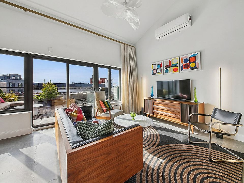 Private terraceModern finishesExposed brickIndustrial detailsCustom draperyPenthouse duplex loftPrivate garage