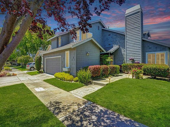 Elegant and inviting Clipper Cove residence offering 3 bedrooms and 2.5 baths in a coveted location near the greenbelt and lagoon. The sunlit living room features a dramatic floor-to-ceiling fireplace, vaulted ceilings, crown molding, custom shutters, and dual skylights. A formal dining room with recessed ceiling and French doors opens to the private backyard. The updated kitchen is appointed with granite countertops, stainless steel appliances, and a charming pass-through window to the garden. The adjacent family room includes built-in cabinetry and opens to both a tranquil, landscaped atrium with pond and the rear yard. Light wood floors grace the entry, kitchen, and family room. The upper-level primary suite offers vaulted ceilings, custom shutters, a walk-in closet with mirrored doors, and a beautifully remodeled bath with marble dual vanities and a spacious walk-in shower. Freshly painted secondary bedrooms, updated guest bath, and a two-car garage with workshop area. Lush, landscaped backyard with redwood deck and arbor. HOA-maintained front yard. Close to ferry, trails, lagoon, and sweeping bay views.