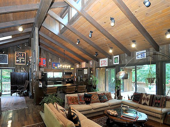 A unique oasis designed and built by an artist whose goal was to utilize the natural beauty and private setting on 6.8 acres by the use of glass, natural wood and stone. While inside, you feel the beauty outside. Nestled in the forest is a lovely sanctuary with an in-ground heated pool and deck. Blaze your own trails, explore your own private woods with rock formations and nature trails. Enjoy an open floor plan, 3 fireplaces and a wall of glass for a light show of sunsets in this eclectic one of a kind gem.