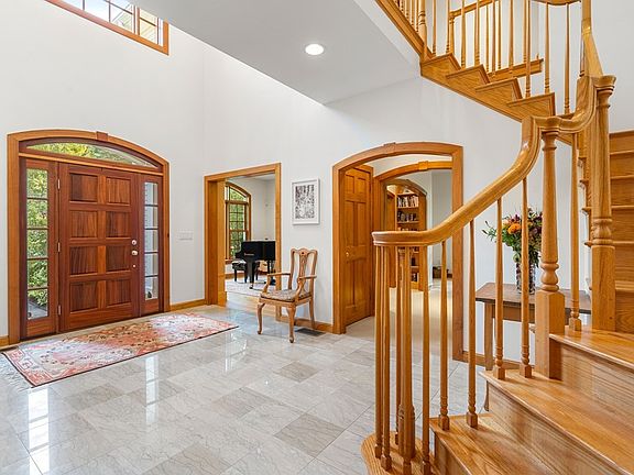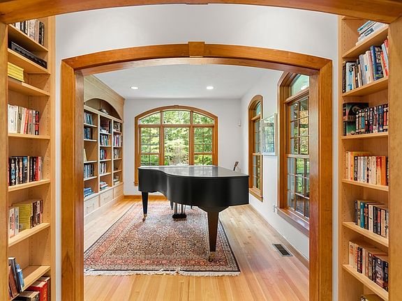 In Carlisle's most cherished neighborhood abutting conservation land, this luxurious home features gleaming woodwork, radiant heat throughout, custom built-ins, wine-cellar, in-ground pool and more. The brightly lit foyer is surrounded by library/living room with bookshelves, dining room and fireplaced family room. A chef’s kitchen with breakfast bar adjoining 3-season porch, custom cabinets, subzero fridge, thermador range, marble counters and 2 story eating area is the heart of this home. The expansive primary bedroom suite offers a separate sitting area, built-ins, spa like bath with cathedral ceiling, jacuzzi and sky lights and large walk-in closet. The lower level is a great finished space with fireplace, windows and outside access, ideal for playroom or office. Gorgeously landscaped with wildflower garden and koi pond, this house has been meticulously maintained and updated. Short drives to Carlisle & Concord centers, award-winning schools and proximity to commuter routes