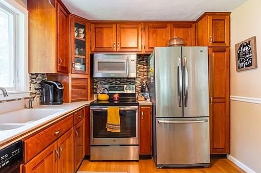 Location, Location Location!! 1/2 acre lot abutting conservation land. This 3 bedroom Over-sized Split style home with outstanding features, hardwood floors throughout, updated kitchen, living room with brick fireplace, attached 14'x17' family room with cathedral ceiling, wood stove, hardwood floors leading to a nice size deck. Also with a lower level finished area with a wood stove insert. FHA heating system with central air. Nicely landscaped yard with a storage shed and patio area. Don't miss this one!!