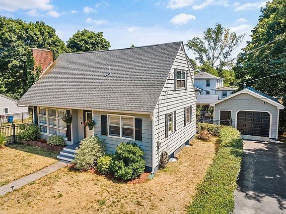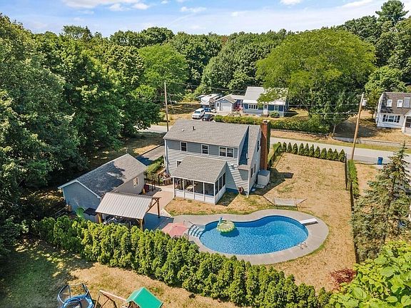 BACKYARD PARADISE! From al fresco dining on a deck under a pergola, to outdoor games & poolside parties w/the privacy of green hedges ~ this charming Cape captivates from the outside in w/the ULTIMATE PRIVATE OASIS! Light & bright main level w/floor to ceiling LR windows, a 2015 renovated kitchen w/granite counters, ample cabinets, & ss appliances. 2 bedrooms, a 2014 renovated full bath and a screened-in porch offer versatile lifestyle options. A wide staircase comfortably ushers you to the 2nd floor with 2 spacious bedrooms, with built-ins, and a 2nd 2014 elegant full bath. The lower level w/ laundry is unfinished but has good ceiling height & offers possibilities of use ~ storage, a pool table, exercise equipment. An oversized 1 car garage and 2 storage sheds provide a home for your lawn and recreational items. LOCATION is key ~ close to town center, trails, shopping & easy highway access to 93 & 495. A gem of a home + a backyard paradise = a brilliant way to redefine home.