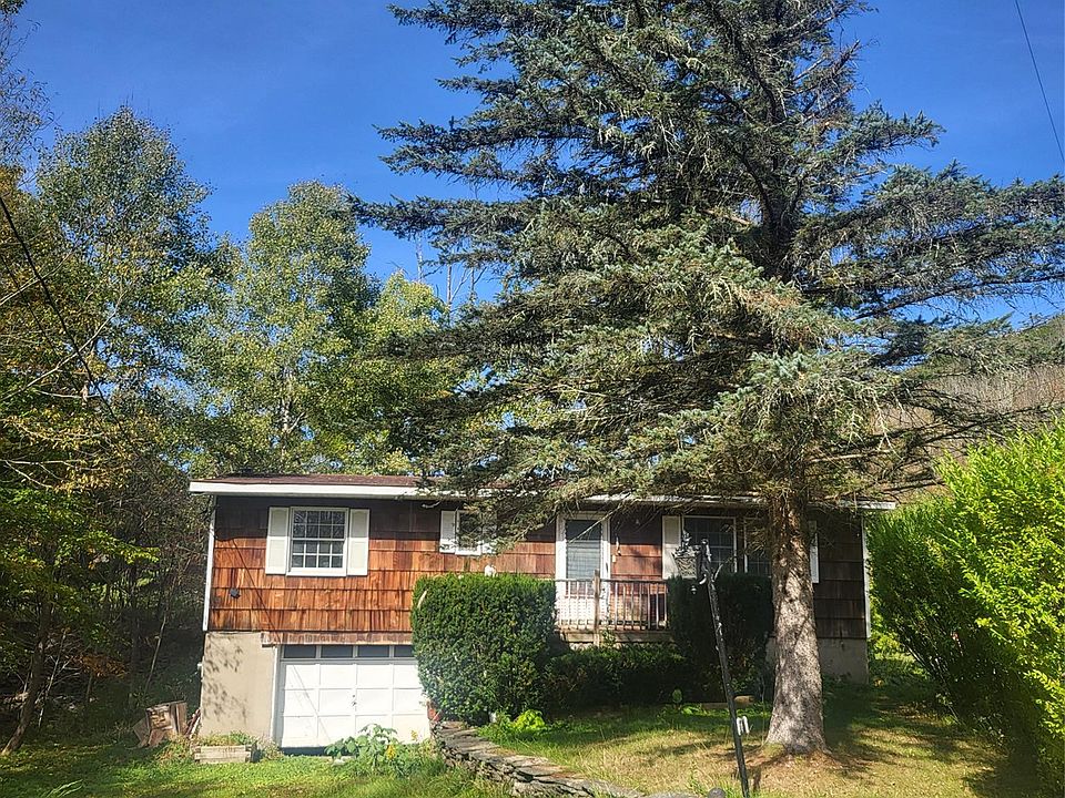 The existing layout features two bedrooms and two bathrooms, providing a solid foundation for a comfortable and functional home. A sunroom adds to the character of the space, offering a perfect spot to take in the natural surroundings year-round. The basement and one-car garage provide additional space for storage or a workshop. In the back, a tranquil creek winds through the property, creating a peaceful natural backdrop and a soothing soundtrack to your mountain retreat.