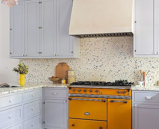 The kitchen, doubled in scale and sited at the rear for garden access, is anchored by a marigold Lacanche range and terrazzo countertops embedded with recycled glass chips. Custom glass pendant lights, cast in Rosaline hues, nod to the 1920s and 1930s. Cabinetry is painted in Farrow & Ball’s Calluna, paired with a copper Waterworks faucet and opal-glass hardware—details that balance durability with quiet elegance. Throughout the townhouse, working fireplaces provide warmth, while reclaimed doors and vintage bath fittings lend texture and authenticity.