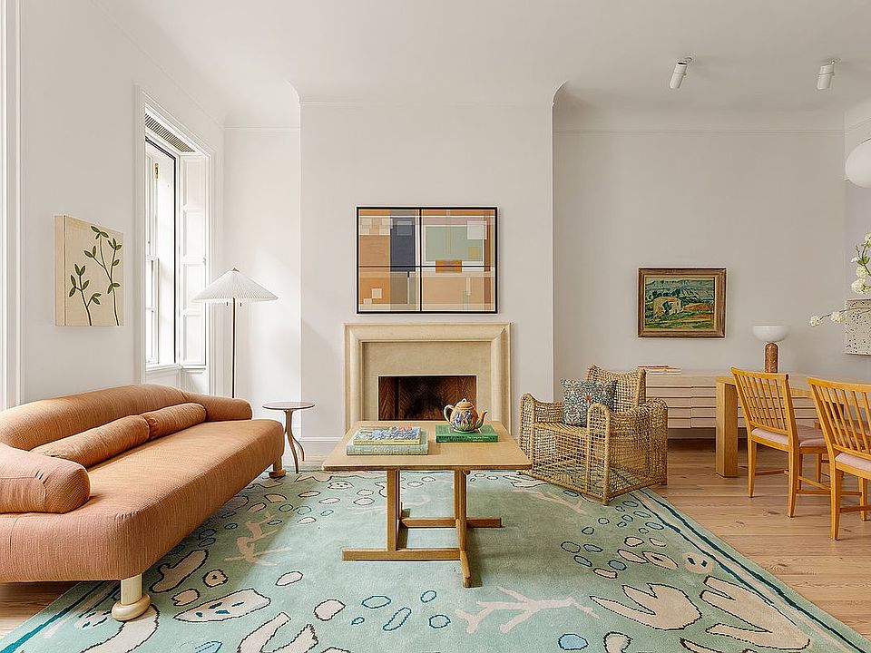 The kitchen, doubled in scale and sited at the rear for garden access, is anchored by a marigold Lacanche range and terrazzo countertops embedded with recycled glass chips. Custom glass pendant lights, cast in Rosaline hues, nod to the 1920s and 1930s. Cabinetry is painted in Farrow & Ball’s Calluna, paired with a copper Waterworks faucet and opal-glass hardware—details that balance durability with quiet elegance. Throughout the townhouse, working fireplaces provide warmth, while reclaimed doors and vintage bath fittings lend texture and authenticity.
