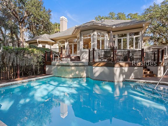 This beautifully updated single-level home offers one of the best opportunities in this price range in Palmetto Dunes or Sea Pines - an easy walk to the beach, impeccably maintained interiors, and a private outdoor oasis that feels like your own boutique resort. Custom-built and thoughtfully refreshed in 2021, the home blends timeless Lowcountry architecture with bright, open living spaces and exceptional functionality. Inside, wide-plank hardwoods, high ceilings, elegant crown molding, and expansive windows create a warm, airy flow from room to room. The great room opens to wooded views and features a classic fireplace with built-ins, while the kitchen offers abundant cabinetry, granite counters, bar seating, and easy access to both the breakfast area and formal dining space with built in cabinetry and wine chiller perfect for evening dining after a day at the beach or relaxing poolside. The spacious primary suite enjoys serene natural views and fabulous new owner's bath, while three additional bedrooms provide flexibility for guests, family, or a private home office. An elevator and oversized two-car garage add convenience for full-time or second-home living. But the outdoor living is the showstopper - a beautifully designed, fenced pool and spa with all new low maintenance decking, all framed by mature oaks and lush greenery. Multiple deck areas offer room for lounging, dining, and entertaining, all with peaceful, private views you rarely find this close to the beach. Whether it's morning coffee under the moss-draped oaks or sunset cocktails by the pool, this setting is pure Hilton Head magic. Used as a second home but equally suited as a primary residence or fantastic short term rental rental, this property delivers comfort, privacy, and unbeatable proximity to the ocean and the best of Palmetto Dunes. A truly special opportunity to make your Hilton Head memories in a home that checks every box.