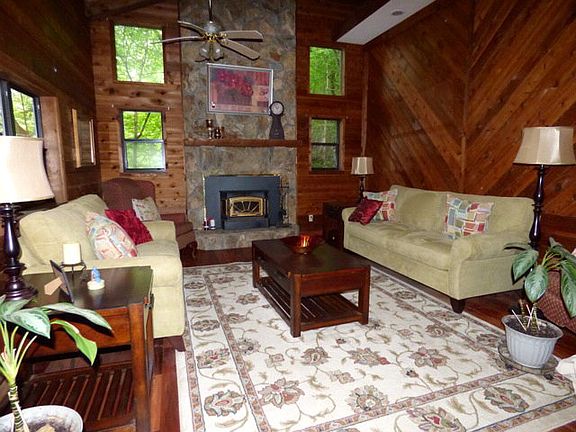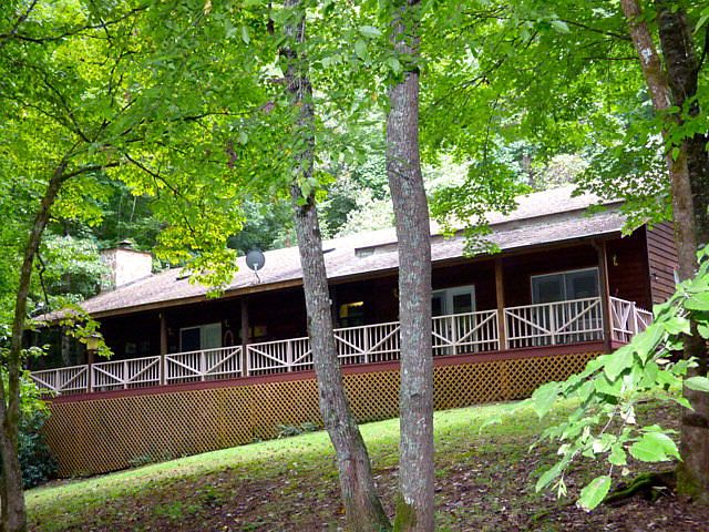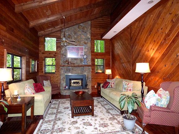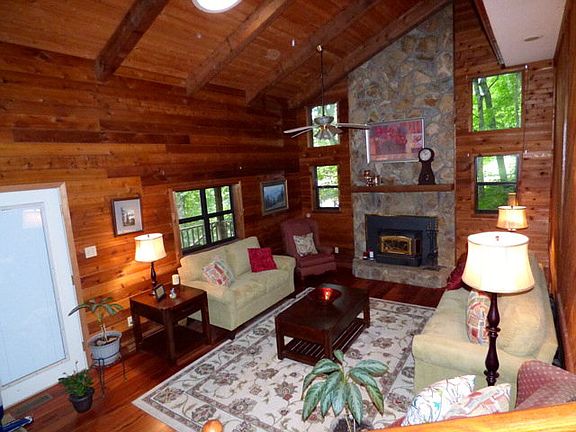 CREEK FRONT MOUNTAIN RETREAT. 3 BR 2B cozy home situated on 1.30+/- flat acres bordering Betty's Creek. 1900+ sq feet featuring a den with separate outside access, dining open to kitchen, wood ceilings, laundry off of master bath, upstairs hallway open to main level, spacious master with private access to back deck and fenced in yard, skylights, natural hardwoods throughout and convenient parking right off of the porch. The covered front porch stretches across the entire home boasting views of the front yard, sounds of the rippling creek, and visits from the neighborhood birds. Large deck out back, large storage shed, and serene views! Priced to sell, don't miss this one!