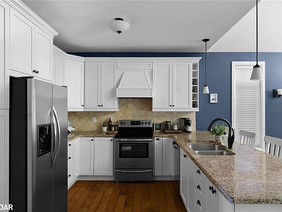 This LEED Canada Certified home combines craftsmanship, comfort, and sustainable design with timeless appeal. Warm wood flooring, transom detailing, and classic doors create a welcoming atmosphere throughout. The layout is highly functional, featuring a bedroom and ensuite on each level, ideal for family visits or overnight guests. The main level is open and inviting with a vaulted living room, stone-accented gas fireplace, and a bright dining area that opens to the backyard. The primary bedroom offers a calm retreat with a walk-in closet and a 4-piece ensuite that includes dual sinks, a granite vanity, and a glass-enclosed shower. A second bedroom, currently used as an office, provides flexibility, while a main-floor laundry room with cabinetry and a sink adds convenience. Upstairs, the family room overlooks the main level and offers space for lounging or hobbies. A large bedroom with two double-door closets and a nearby 4-piece bath with a granite vanity complete this level. The finished lower level extends the living space with a recreation room featuring a stone-accented fireplace, an additional bedroom, a versatile finished room currently used as a gym, and a full bathroom. The home includes a rough-in for central vacuum, an owned tankless water heater, an in-ground sprinkler system, and exterior wiring for a hot tub. A new Trane furnace was installed last year for added efficiency. Located within the Horseshoe Valley community, this property offers easy access to Horseshoe Resort, Copeland Forest, Hardwood Ski and Bike, and The Heights Ski and Country Club. Nearby amenities include the new community centre and school at the end of Highland Road, as well as local favourites like Braestone Kitchen, Mariposa Market, and Homestead Bakery. Fibre internet from Bell and Rogers supports reliable connectivity. This home captures the best of comfort, community, and the active Simcoe County lifestyle.