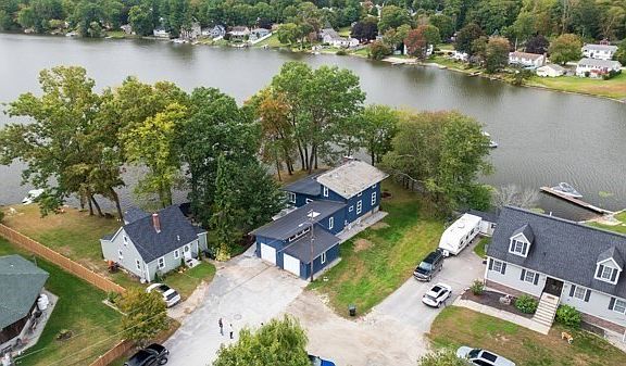This is a studs out total renovation. New four zone heating system. Total new wiring throughout this home. New plumbing, two new kitchens with new appliances. New thermopane windows and new thermopane sliders. New wrap around deck overlooking the water. The second floor has been converted into a master bedroom suite with new full bath and fixtures. There is a new rubber membrane roof. The lower level is a four room one bedroom legal in-law apartment. Separate entrance, separate laundry, large bedroom with cedar closet. Fireplaced living room. Enclosed three season porch. Two car attached garage. 180 feet of frontage on level lot located on dead end street. Professionally landscaped. This is a one of a kind waterfront. Your own peninsula with the privacy it provides. Sandy beach with easy access for swimming, kayaking, water skiing, etc. Enjoy four seasons of fun.