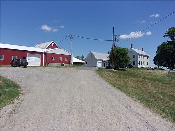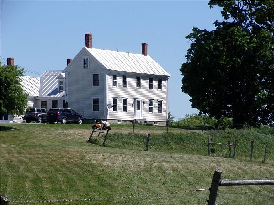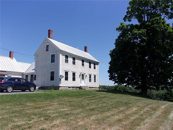 Rolling green fields and pastural views from every part of this property. Renovated historic colonial, custom cherry kitchen cupboards, granite countertops, stainless steel appliances, pantry with second kitchen sink, tile , oak and wide pine floors. Wonderful family room with Cathedral ceiling and massive stone fireplace. Large bedrooms. Electrical, heating, insulation, sheetrock, siding and septic have all been upgraded. There are several large barns on the property that have metal roofs and siding, concrete floors along with a large metal silo. This would be an excellent location for a business , storage company, as well as a farm. Convenient location just off a main road yet very private.