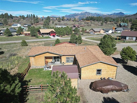 Enjoy mountain living at its best in this bright, open home on two lots with breathtaking views of Pagosa Peak. The inviting floor plan features vaulted ceilings, a large kitchen with a peninsula and pantry, and plenty of natural light throughout. Relax on the covered porch or patio, enjoy the fenced backyard, and take advantage of the extra storage space and shed. Additional highlights include on-demand hot water, ceiling fans, and extra parking. Ideally located on a quiet cul-de-sac just minutes from Lake Hatcher and the National Forest! Furnishings are negotiable.