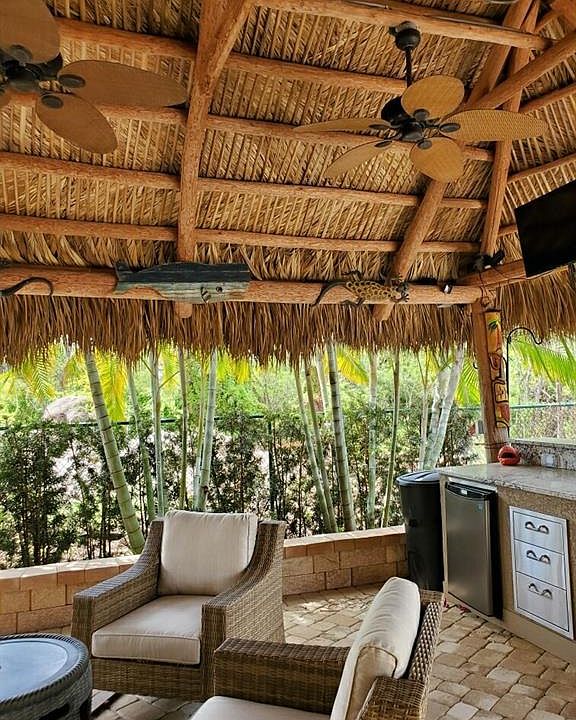 A slice of paradise! This lot backs onto the preserve providing a spacious, green backdrop and plenty of privacy. Newly expanded L shaped tiki is equipped with custom granite top kitchen, fans, and fully furnished. The mature landscaping and raised landscape bed add to the beauty and privacy. Conveniently located between two of the satellite pools and near the large bark park. Short walk to the sports facilities and the very active clubhouse with many planned parties and events. True resort style living with an 18 hole golf course, pickle ball, tennis, bocce and shuffleboard.