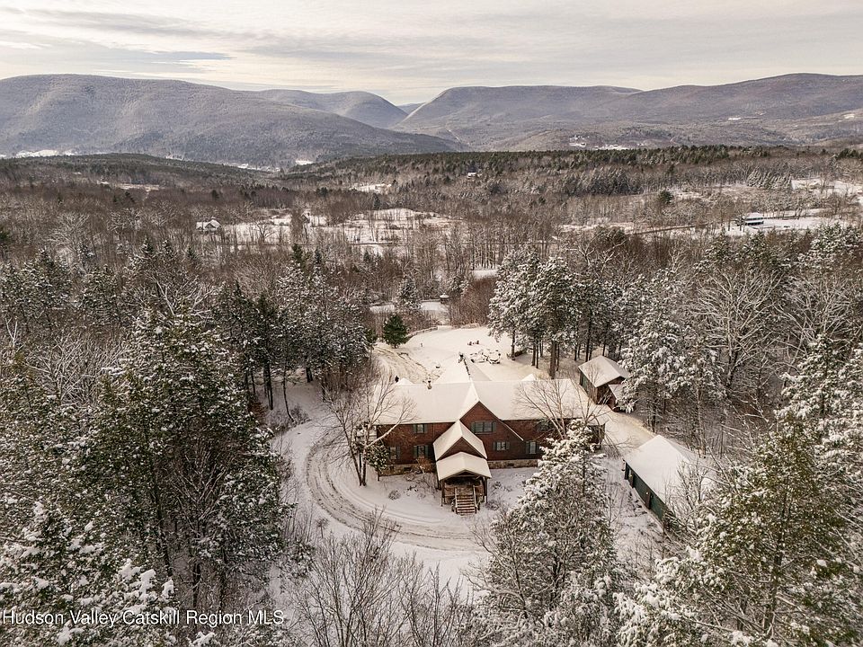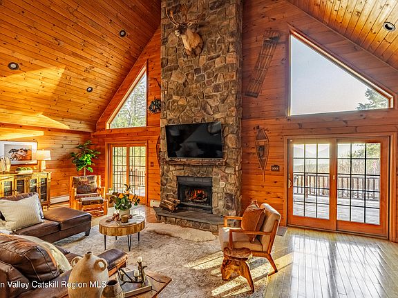 Set on a private mountainside in the Catskills village of Lexington, this expansive log home enjoys open, long-distance views directly into one of the Catskills' most dramatic mountain passes, defined by steep ridgelines and a broad notch that changes visibly with weather and season.