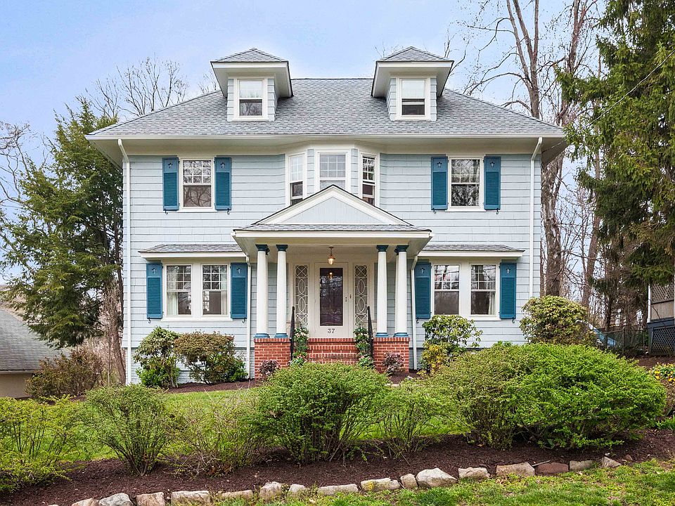 Majestic colonial in desirable Tuscan neighborhood just steps from NY train, park and village. Open front porch leads to stunning foyer w/hi ceilings, hardwood floors. Spacious LR w/WBF, built-in bookshelves & windows above. Pocket doors to large DR w/built-in cabinets & entrance to charming breakfast room. Country-style kitchen w/pantry. Convenient PR. Den off kitchen leads to large, open deck. 2nd fl. master suite w/sitting room and outdoor porch. 2 addtl. beds. and full bath on this level. 4th bed. on 3rd level. Finished basement w/carpeted family room & newer FB. Convenient laundry & addtl. storage. French drains & sump pump. Exterior just painted. Stunning gardens & enormous curb appeal. So easy to call home!