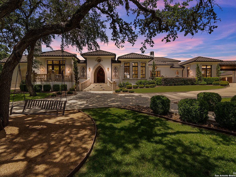 Discover a hidden gem in the perfect location. 37 Old Fredericksburg Rd in Boerne, TX, an inviting estate nestled on just over 10 acres of peaceful Hill Country landscape with an agricultural tax exemption. As you arrive, an impressive, gated entrance leads you down a scenic drive, hinting at the grandeur within, leading you to a home that's been thoughtfully designed to blend beauty, privacy, and luxury. The property offers a gentle balance of wide-open space and quiet privacy, with mature trees framing manicured lawns and a tranquil pond with a charming fountain. A professional grade putting green for the golf enthusiast, while the overall setting invites you to slow down and take in the surrounding nature, ensuring privacy and picturesque views from every angle. The main residence reflects timeless Spanish-inspired design, a masterpiece featuring a stunning stucco exterior adorned with elegant Cantera stone accents, graceful arches, and a grand entryway that welcomes you into a world of refined elegance. Inside, the spaces are open, light-filled, and thoughtfully arranged. Including a formal living room with striking vaulted ceilings and fireplace, and a formal dining room perfect for gatherings and entertainment. The gourmet kitchen is a chef's dream, both beautiful and functional-custom cabinetry, high-end appliances, and two large islands. Each bedroom provides a peaceful retreat, each with unique touches and views. The luxurious master suite features a private fireplace and an opulent en-suite bathroom with a freestanding tub and ample storage. Dedicated home offices provide ideal spaces for work or study. The home naturally flows to the outdoor living spaces, designed for memories to be made. A sparkling swimming pool with a slide and elevated spa offers a refreshing escape on warm days, surrounded by ample patio space for lounging and entertaining. An enclosed outdoor living area provides a comfortable space for al fresco dining, conversation, and relaxation. The expansive grounds also include a productive garden, a treehouse and swings, and a convenient storage shed. A spacious detached four-car garage provides plenty of room for vehicles and storage. This exceptional property at 37 Old Fredericksburg Rd is more than just a home; it's a private hidden gem offering a lifestyle of tranquility and luxury with easy access to everything the epitome of Texas Hill Country living has to offer.