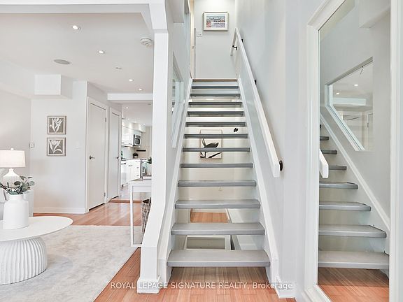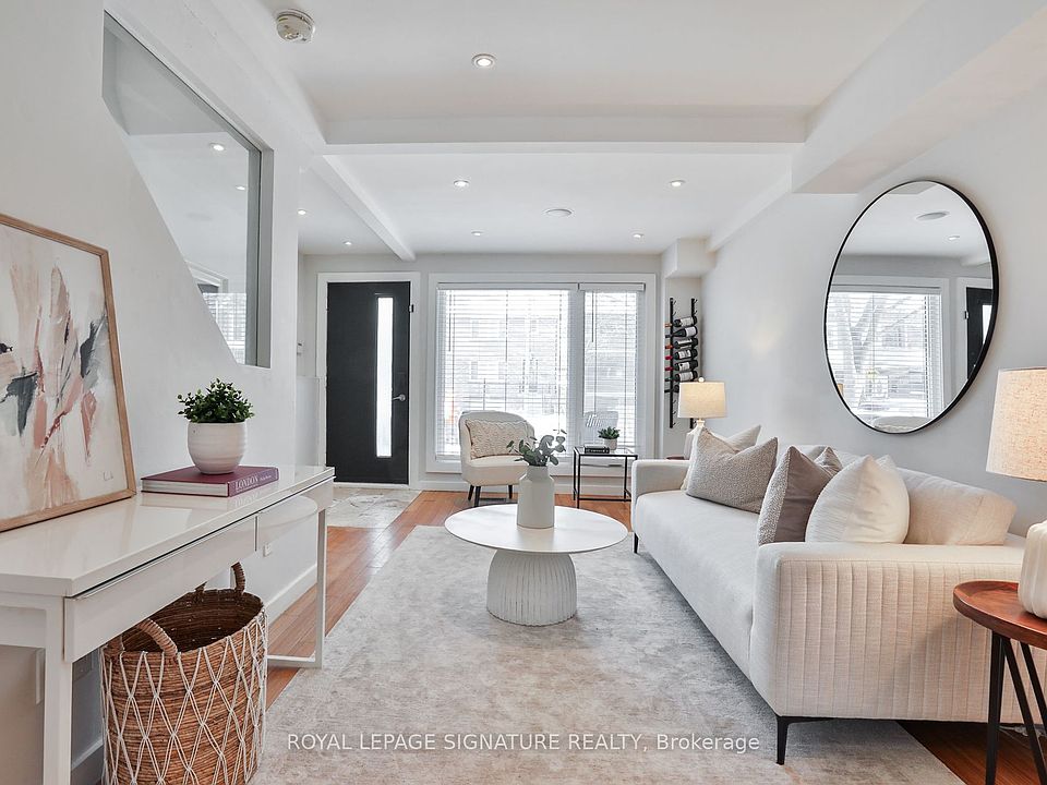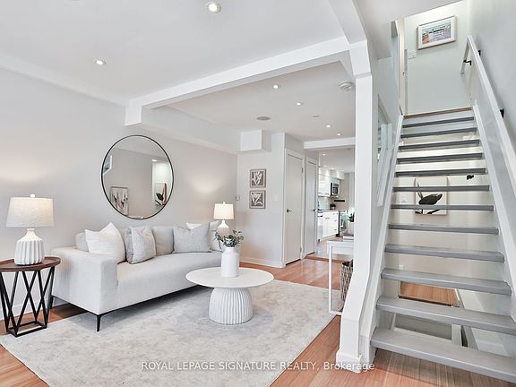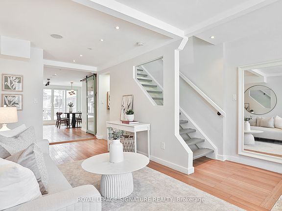 Your "Rhodes" to café days & beach boardwalk nights. Set in one of Leslieville's most coveted pockets, this charming, tight-knit community offers exceptional walkability to schools, transit, bike lanes & even the beach! 37 Rhodes makes an immediate impression with standout curb appeal & thoughtful updates. Inside, warm bamboo flooring runs throughout the home, while new front windows (2025) bathe the space in natural sunlight & pot lights brighten every corner. The tiled entryway offers a polished yet practical welcome, while dual closets keep coats & shoes neatly tucked away with one functioning perfectly as a pantry to keep essentials within reach. A rare & highly sought-after main-floor powder room adds everyday convenience you don't often find in Leslieville. The living room strikes the perfect balance with an open-concept layout that flows naturally into the dining area & kitchen. Built-in surround sound on the main floor & exterior elevates hosting & everyday living. At the rear of the home, the kitchen truly shines with brand-new stainless steel appliances (2026), white cabinetry, butcher block countertops, matte black hardware & a penny tile backsplash that adds warmth & personality. Bathed in natural light from the full-glass back wall & sliding door (2022), the bright eat-in dining allows for seamless indoor/outdoor living, BBQing & entertaining. A skylight over the staircase brightens the entire upper level, while the generously sized 4-piece bathroom features its own skylight & modern finishes. A versatile den adds flexible space, perfect for working from home, a spin on the Peloton or creative pursuits. The primary bedroom offers a true retreat with vaulted ceilings & room for a king-size bed & two closets for optimal livability. The second bedroom is equally well-sized, fitting a queen bed with room to spare. This is peak Leslieville lifestyle: walkable, welcoming & close to the beach. This Rhodes leads home.