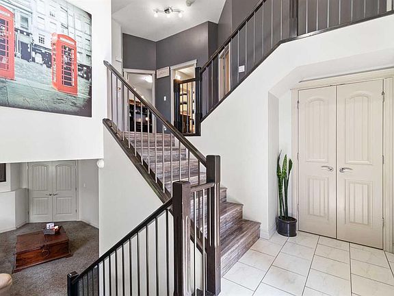 This well-cared-for home immediately stands out with its custom landscaping and decorative curbing, all backing onto a walking path. A spacious tiled entry welcomes you inside, where vaulted ceilings draw you up to the main living area. Built by Falcon Homes, this sought-after floor plan offers two bedrooms and a full four-piece bath on the main level, with the kitchen, dining, and living spaces designed for open-concept entertaining. The kitchen features dark cabinetry, stainless steel appliances, a corner pantry, and a black granite sink. From the dining area, garden doors open to a recently refinished oversized deck, perfect for overlooking the expansive yard and flower gardens. Enclosed storage beneath the deck adds practicality and keeps outdoor items organized. Above the garage, the private primary suite includes a walk-in closet and three-piece ensuite. The fully finished basement provides additional living space with a large family room, extra bedrooms, and another full bath. One particularly spacious room with French doors is currently set up as storage but could easily transition into a fifth bedroom with the addition of flooring . There’s also convenient storage tucked under the stairs. Notable upgrades include air conditioning (installed in 2023), roughed-in in-floor heating, a newer hot water tank, and custom blinds throughout the upper levels. This property is ideally located just a short walk from Iron Ridge Intermediate and St. Gregory the Great schools, making it an excellent choice for families.