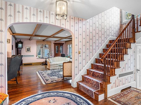 This classic Tudor offers warmth, character, and exceptional space. The living room features a large fireplace, reading alcove, and room to entertain, opening to a bright den and an updated sunroom with access to the yard. The spacious dining room has morning light, chair rail, crown molding, and stained glass side windows. The large eat-in kitchen includes ample cabinets, a bar sink, a breakfast bar, and a step-down sitting area with great yard views, two doors to the outside, a built-in desk, and access to the second floor and finished basement. The basement adds a bar, fireplace, workroom, storage, and laundry. The second floor offers six bedrooms and three baths, including two potential en suite options, plus a full walk-up attic. The private yard features a main patio, grilling patio, oversized garage, and a two-story playhouse or garden space with star-watching windows and a loft, along with rear fencing and a gate to the next street. Close to the beach, shops, restaurants, etc.