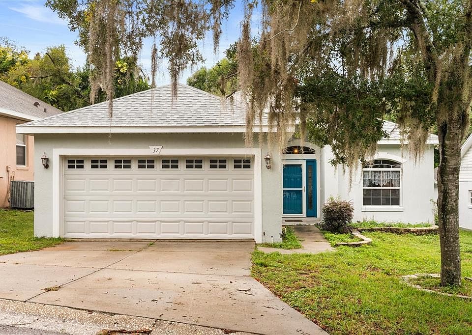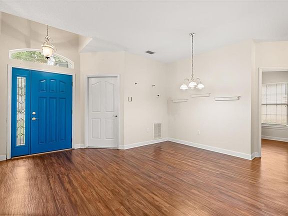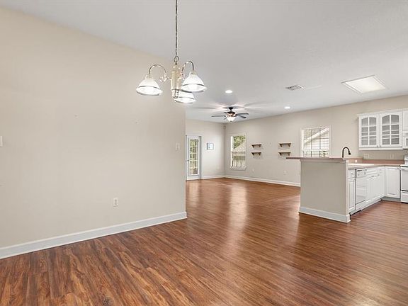 Discover a charming 3-bed, 2-bath home in a cordial Eustis neighborhood, featuring high vaulted ceilings, an open-concept kitchen/dining/living area perfect for entertaining, and a convenient split-bedroom floor plan. This home is nestled in a quiet, endearing neighborhood in Eustis with a strong sense of community where neighbors are friendly and connected. This beautiful residence boasts a functional kitchen with ample space for a breakfast table and sleek, matching appliances, all complemented by elegant dark red engineered wood. A practical split-bedroom design offers privacy and separation between the master suite and guest rooms. French doors lead from the living room as an elegent transition to the master bedroom suite. The master bedroom is designed for comfort and relaxation with enough space for a sitting area and a spacious walk-in closet with custom shelving for abundant storage. The en suite bathroom features a double-vanity, a large walk-in shower for a spa-like experience, and a separate, generous garden tub for soaking. Townhill is located within a 5 min drive to shopping, hospitals, and Dr offices.