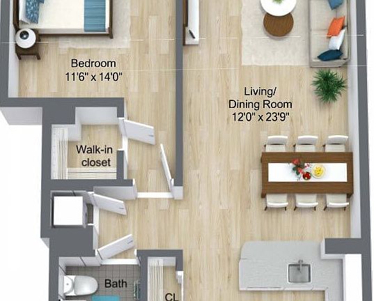 Spacious 1 bedroom with a giant U-shaped kitchen with granite counters, stainless steel appliances, and an eating bar. The apartment features a walk-in closet, wood floors in the living areas, a contemporary bathroom, and an in-unit washer/dryer.