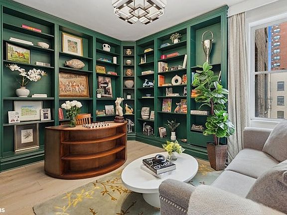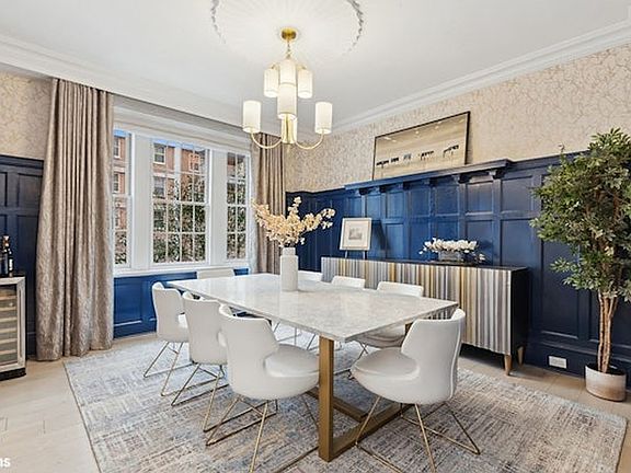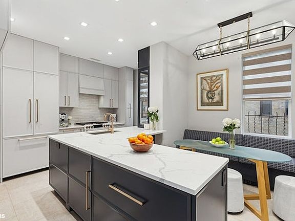 The heart of this home is the beautifully renovated, windowed eat-in kitchen. Thoughtfully designed, it features custom floor-to-ceiling cabinetry, Bosch suite of appliances, and exquisite quartz countertops. A center island and banquette seating provide ample workspace and dining options, while a rare floor-to-ceiling pantry-spanning nearly ten feet-offers unmatched storage for every kitchen necessity. Every detail of this chef's kitchen has been custom-crafted for style and efficiency. One the same floor, a classic library boasts floor-to-ceiling built-in shelving and additional closet space. High ceilings, tree-lined street views, recessed lighting, and luminous chandeliers add to the home's refined atmosphere. Brand-new wide-plank oak hardwood floors further enhance its sophistication.