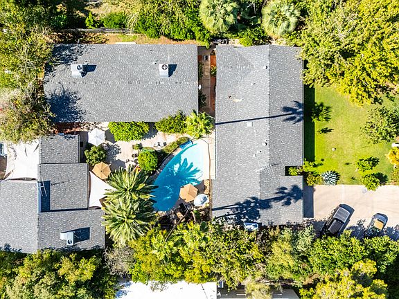 The main residence offers three AC split systems for zoned climate control, updated bathrooms (2023), a primary suite with kitchenette and 220v power, and original stained concrete flooring. Other highlights include re-insulation (2024), copper electrical conduit, a fire sprinkler system (2018), wood and cellular blinds, stackable washer/dryer, and a cozy gas fireplace. Outdoors, enjoy a resurfaced pool (2018) with newer pump (2024), outdoor shower, and gas line hookups for heating or firepit. Patio and underground wiring with lighting were added in 2019. The home is fully gated with coded Schlage locks and modern security including Google lighting controls and cameras.