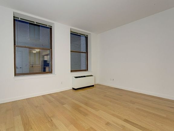 Spacious studio with modern finishes in luxury building located in the heart of the Financial District. Features large, open living area adorned with beautiful Oak hardwood floors, 10' high ceilings, expansive walk-in closet, and second nicely sized closet for additional storage. The residence also includes a fully-equipped kitchen with generous cabinet space, natural stone countertops, and stainless steel GE appliances including microwave and dishwasher. The lavish full marble bath is appointed with Carrera marble and polished chrome.