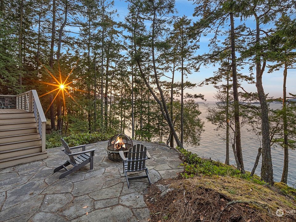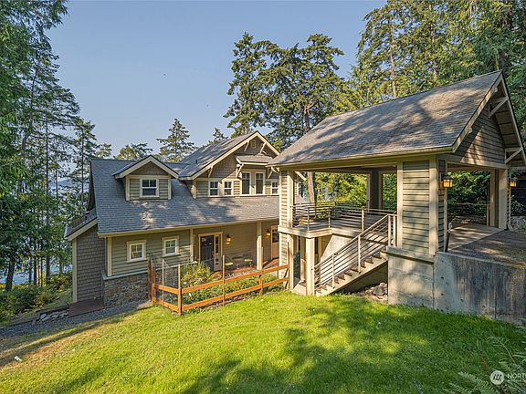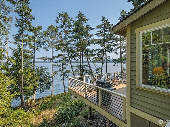 This classy waterfront home is exceptional in design and implementation with many impressive functional details that make all the difference: 3 bedroom, 2.5 bath with bonus room (4-bedroom septic system), first floor primary suite with its own deck, wood flooring, marble countertops, propane fireplace, DSL & Satellite internet. All bedrooms have french doors with transoms. Enjoy the beautiful views across San Juan Channel to Shaw and Orcas Islands and beyond. Mahogany decks, stone patios, raised bed garden, and a large shop under the carport. Offered fully furnished. Priced below Assessed Value.