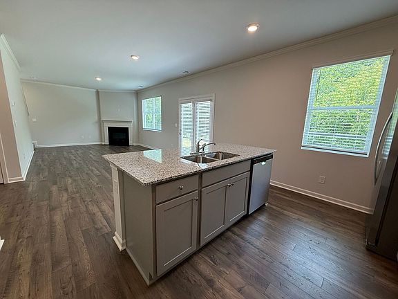 Step inside to find a versatile flex room off the foyerperfect for a home office, dining area, or creative space. Continue into the heart of the home where an open-concept kitchen and great room offer the perfect setting for entertaining and everyday living. The kitchen boasts granite countertops, subway tile backsplash, shaker-style cabinetry, stainless-steel appliances, a large pantry, and a central island with bar seating. The spacious great room includes a cozy corner fireplace with a slate surround.