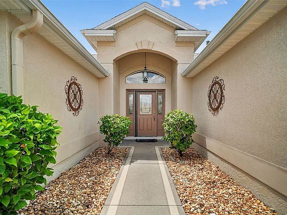 Welcome to this breathtaking LANTANA featuring a VIEW and NO BACK NEIGHBORS. This exquisite property showcases a variety of outstanding upgrades and thoughtful details that make it an ideal place to call home. The mature landscape includes curbing with rocks. Inside, the home is adorned with CROWN MOLDING and a spacious foyer, with tile flooring throughout the living areas. To the left, the hallway leads to two guest bedrooms equipped with ceiling fans and closets, along with a guest bathroom. The Primary bedroom features a tray ceiling, a fan, a walk-in closet, and an en suite bathroom that includes double sinks, a makeup area, a glass walk-in shower, and a toilet closet. The stunning VIEWS from the main living area are peaceful. The kitchen is equipped with ample cabinets, stainless steel appliances, and under-counter lighting. The living room seamlessly transitions into the enclosed LANAI, which boasts large windows for enjoying a 180-degree VIEW. The property's excellent location in the VILLAGE OF MALLORY provides convenient access to all your needs, including the nearby ODELL Recreation Center, shopping, dining, medical offices, and entertainment at Sumter Landing and Brownwood squares—all just minutes away. Don't miss the opportunity to own this remarkable home—schedule your private tour today!