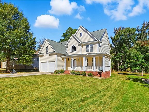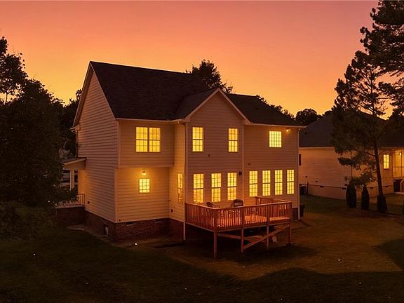 Charming traditional two-story home on a 0.27-acre lot with a spacious front and back yard. Features a two-car garage, a covered front porch, and a backyard deck backing to trees for privacy. Inside, enjoy real wood floors, a grand staircase, and a double-sided fireplace between the living and family rooms. The open kitchen boasts granite countertops, a glass-top stove, stainless steel refrigerator, and an island. The master suite is a retreat with a sitting area, garden tub, walk-in shower, dual sinks, and a large walk-in closet. Three additional bedrooms share a bathroom upstairs.