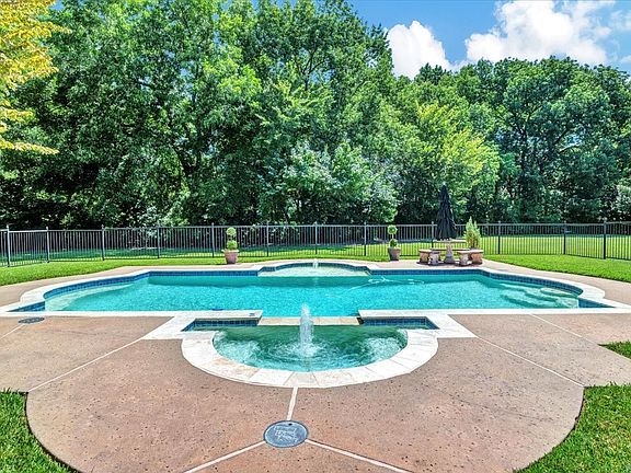 Exquisite French Country Estate Manor is perfectly situated on 1.7 acres along a tranquil creek. This two story home with four car garage located in prestigious Oakwood Estates and Lovejoy ISD is ideal for family living and executive entertaining. Entry through the grand foyer with breathtaking award winning ornamental iron sweeping staircase inspired by an actual railing in a French Chateau. The entry opens to owner's study with built in workspace and extensive cabinetry, wonderful formal living with fireplace and elegant dining room with unimpeded view into the garden and private woods. Updated kitchen and breakfast room feature rustic beamed ceiling and state of the art appliances. Great room enjoys beautiful panoramic view of sparkling pool and spa and towering trees bordering the creek. Adjacent to great room pocket door opens to media room with 100 inch screen and whole home audio. Primary suite features lovely backyard view sitting area, luxurious marble bath with two vanities, walk in shower, soaking tub and oversized closet. Upstairs, which can be accessed by two staircases, includes a versatile game room, three ensuite generously sized bedrooms, a bonus room and a library loft overlooking the foyer. The covered outdoor living area, secluded by creek and trees, includes a stone cooktop with Viking grill and dining area overlooking the 36 foot pool and spa. Beyond the pool is room for play and family fun on extensive greenspace. There are many recent updates which include pool renovations with new heater, encapsulation of attic with foam, vented Carrier 24 SEER HVAC units with air purifiers and smart thermostats, hot water heaters with recirculating pumps, exterior and interior painting and much more. Must see to appreciate this exceptional Fairview Estate!