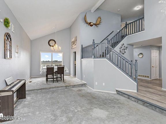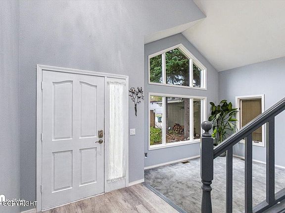 Discover your dream retreat in this sunlit, spacious home, complete with a south-facing deck and dedicated RV parking. On the main floor, you'll find a grand vaulted ceilings, elegant dining room, a kitchen that flows seamlessly into the family room, and a convenient back deck. There's also a bedroom and bathroom for easy living. Upstairs, the master suite is a luxurious haven.The versatile lower level is set up with an amazing theater room, AND an additional bedroom adding flexibility. Storage is abundant on every floor. The oversized 676 sq. ft. garage features built-in storage that reaches the two-story ceiling. Prime location, with quick access to JBER, Alaska Regional, and downtown Anchorage. Flat, paved driveway ensures easy access. Tranquil perennial gardens create a peaceful outdoor escape.