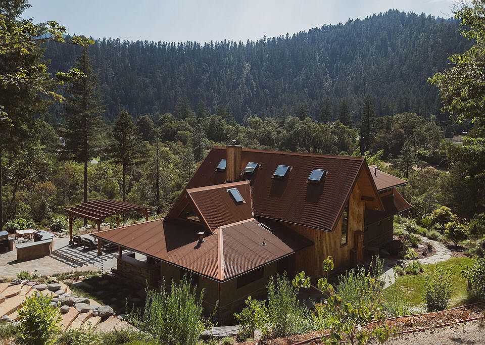 Welcome to River Bend Sanctuary, a one-of-a-kind eco-conscious homestead that perfectly blends modern sustainability with timeless elegance. Nestled on over 4 acres of pristine land in stunning Humboldt County and overlooking the tranquil Trinity River, this 1,980 sq. ft. custom home embodies the natural beauty and serenity of Northern California. Thoughtfully designed, the property combines architectural charm with innovative, environmentally friendly features, creating an unparalleled living experience. The home offers three spacious bedrooms, two baths, and a cozy loft, all bathed in natural light and crafted with reclaimed materials and meticulous attention to detail. Each space reflects a harmonious fusion of contemporary comforts and historical allure, from the warmth of the Tulikivi masonry heater to the unique mix of madrone, slate, soapstone, and earthen floors that bring the natural world indoors.