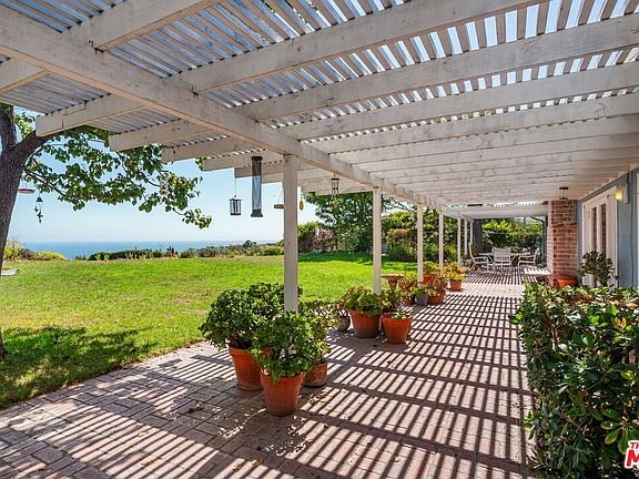 Perched just above the Getty Villa in Pacific Palisades, this Pacific View Estates retreat is now available for the first time EVER! Only moments from Sunset Blvd @ PCH and Gladstones, and just a block to the beach. A classic 60s ranch commands wide frontage and a deep half-acre lot, with an enormous private flat pad in this prime, groomed enclave with underground utilities and wide streets, largely untouched by recent fires. See the sailboats on the Pacific from the house, hear the waves and birdsong carried through the canyons & coastal air, giving a sense of calm and connection to nature, yet so close to town. With close to 3,000 square feet, the 5 bedroom/3.5 bath residence unfolds with classic Mid-Century flow, including a large foyer leading to interconnected open concept public spaces: living room with fireplace, dining room, and family room with a wet bar, each steps away from the wide patio, grassy yard, canyon, and alluring ocean views. A generous kitchen includes a breakfast area and adjacent 5th bedroom/maid's quarters with bath (more ocean views), perfectly positioned for creative, minor floor plan adjustment whether as a den, office, enlarged kitchen, or other use. The private wing of the home offers 4 bedrooms (3 + convertible den) and 2.5 additional baths, including an extensive primary suite with walk-in closet, providing quiet separation from the main living spaces and direct garden access with views. A large, direct access 2-car garage and original circular driveway option (2 curb cuts remain in the broad front yard) complete the offering. Payment of nominal, optional HOA dues to the Pacific View Estates HOA (waived in 2025) provides annual passes to the Getty Villa for residents and guests without reservations. Whether thoughtfully updated or completely reimagined, here is your opportunity to create a legacy estate in one of the Palisades' most coveted enclaves.