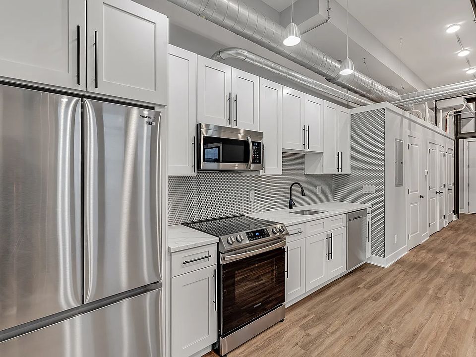 The kitchen is outfitted with stainless steel appliances, white cabinetry, and a clean backsplash that adds to its contemporary style. Large windows flood the living space with natural light, highlighting the wood-look floors and high ceilings with exposed ductwork, giving the home a chic, industrial edge.