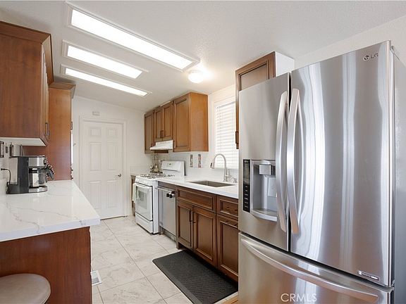 Welcome home to this upgraded & spacious mobile home located in the prestiogus community of Santiago Estates! This upgraded home is not one to miss. Located on a corner lot with covered porch and parking port! Upon entry you are greeted by a well maintained exterior with an Entering the home you are greeted by new/updated wood vinyl flooring and neutral paint throughout. The spacious living area flows into the newly renovated kitchen featuring updated wood cabinets, new quartz counter tops and appliances! Down the hall welcomes the bedrooms featuring - 2 bedrooms (with the 3rd bedroom used as an office). The enclosed backyard is not one to miss with plenty of space and a custom storage shed! The community is small and quiet with a friendly neighborhood and well kept.