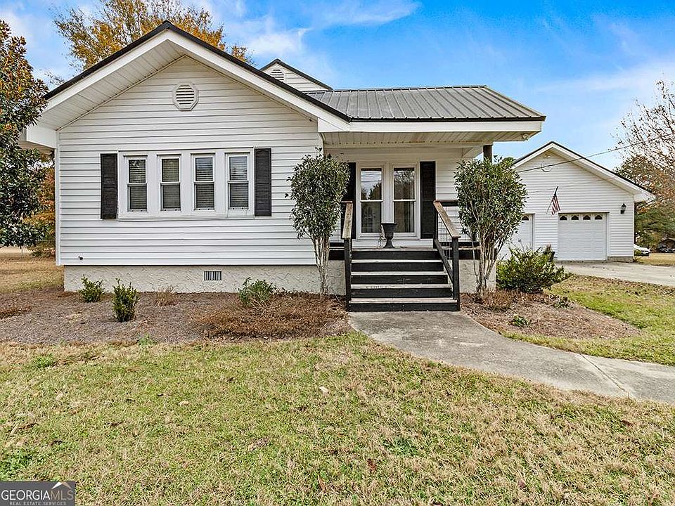 Welcome to this beautifully updated 3-bedroom, 2-bathroom home, nestled on a flat 1.46-acre lot. Built in 1950, this home boasts a blend of classic craftsman details and thoughtful modern updates, designed to match the original parts of the house perfectly. From the new front porch, step into your living room, where sunlight floods this cheery space from gorgeous original window casings. Move next into the dining room and kitchen, large enough for your dinner table and guests at the peninsula bar. This open-but-not-too-open layout lends itself perfectly to hosting all of your family get-togethers! More windows bring light and warmth to the charming, tidy kitchen. Just off the dining room you'll find an additional space to utilize as an office, playroom, or even a potential fourth bedroom. The spacious 16x20 master suite is an amazing space to unwind, with a cathedral ceiling and French doors to the back deck overlooking the backyard. Sip your coffee and watch the sunrise from bed or your favorite cozy chair! The master bathroom, completely renovated in 2024, showcases classic subway tile, a sleek double-sink vanity, and contemporary finishes in the shower that perfectly complement the vintage feel of the home. The two other secondary bedrooms are both great sizes for guests and children to have their own private spaces. Both bedrooms have original heart pine floors under the carpet that could be stunning with a quick restoration! Sitting in between the secondary bedrooms is the second bathroom, preserving its 50's charm with the original cast iron tub and new subway tile surround, adding a touch of nostalgia to the home. The expansive backyard offers endless possibilities: enjoy gardening in rich, loamy soil, toss the ball with your kids, start your mini-homestead, or create your own outdoor dream space! The septic tank is located on the side of the house, so this backyard would be perfect for an in-ground pool (or take advantage of the existing above-ground pool! For hobbyists or anyone in need of extra space, the two-car garage features a workshop with its own back garage door entrance, a ramp, and covered storage out back for all the extras' a dream for tinkering, crafting, or just relaxing. Upstairs, you'll find additional storage space. Convenient to I-75/475, just minutes from a beautiful new community park with pickleball courts and playgrounds, yet tucked just far enough away from the city, you couldn't ask for a better location. This home is a true gem, retaining much of its original charm while offering opportunities to make it your own. Don't miss your chance to own this unique piece of history in the heart of Lizella!