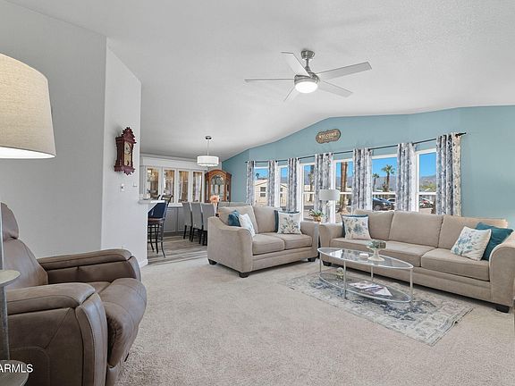 Fresh, bright, and spacious. Come home to the beautiful 2bd/2ba, double-wide, manufactured home located in the relaxing senior community of Quail Run Mobile Home Community, outfitted w/community pool/spa, fitness center, community center, and more. Built by Palm Harbor, the open floor plan allows for entertaining or relaxing. Superstition Mountain views are visible out the large living room windows. Outfitted with a nicely sized kitchen, breakfast bar, and dining room, enjoy cooking for friends and family. The living room leads to the hallway which then takes you down the hallway to the generously-sized guest bedroom and master bedroom. The beautiful master bathroom has a walk-in shower for easy accessibility. Moving to the guest bathroom, you'll find more beautiful updates with accessibility features added. The Arizona Room is fitted with large windows and ingress/egress on both ends of the room. Exit out the door and you'll find yourself on the relaxing patio where you can enjoy the sunsets or drink a morning cup of coffee. The new HVAC will keep you comfortable for years to come. Plan your private tour!