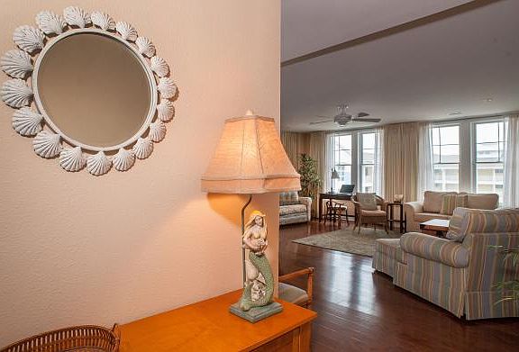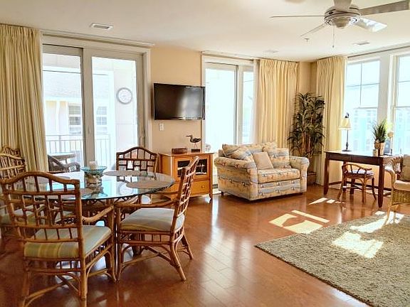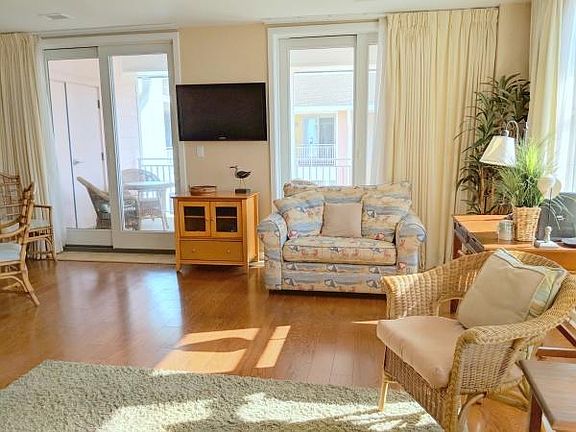 Enjoy the special views afforded by the light-filled living room, featuring comfortable sofas, oversize lounge chair that converts to a twin bed, 40-inch flat-panel HDTV, sound system with a 3-CD player, and a desk with free wireless high-speed wireless Internet access. The dining area includes seating for six, with room for three more at the granite kitchen counter. From this area you can access the spacious balcony, ideal for relaxing with a cup of coffee in the morning or watching the sunset over cocktails in the evening. The gourmet kitchen features granite counter tops, stainless steel appliances, and is fully stocked with everything you could possibly need to enjoy your time at the beach. The master suite, with private full bathroom, provides a king-size bed, chair for reading, 19-inch flat-panel HDTV with built-in DVD, and room-darkening window treatments. The second bedroom provides two twin beds and a 19-inch flat-panel HDTV with DVD player. A second full bath is located just outside the bedroom door (hairdryers are provided in both bathrooms). The laundry area within the unit provides a washer and dryer, iron and ironing board.