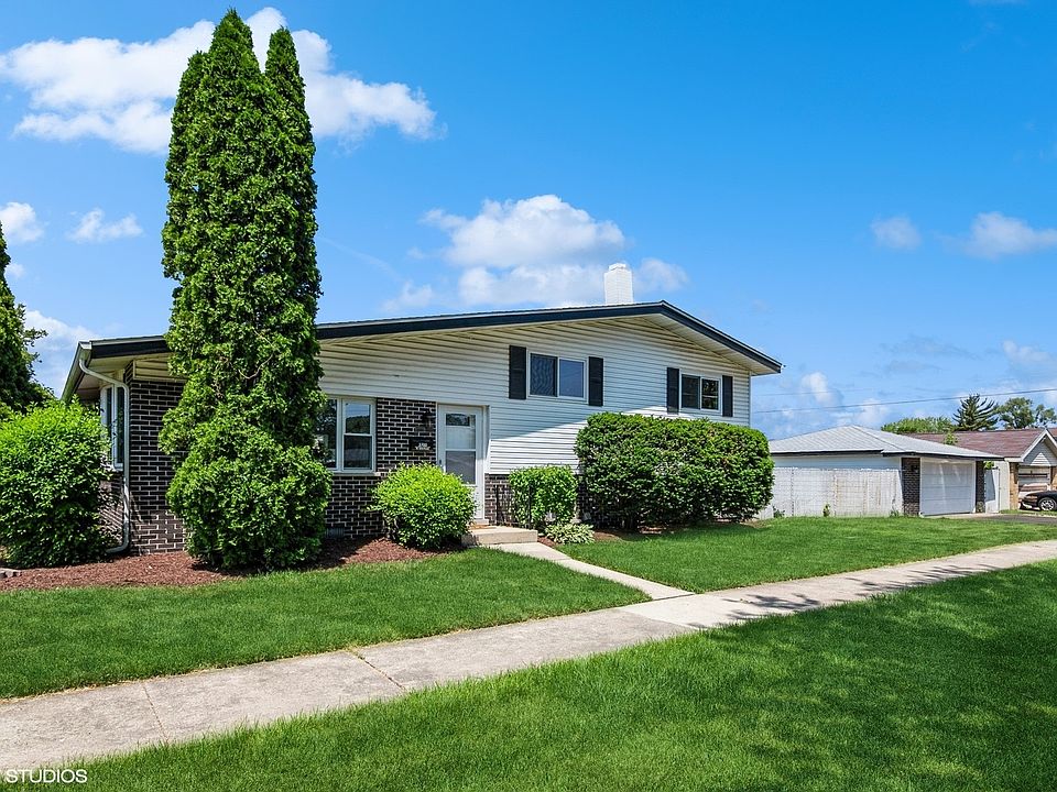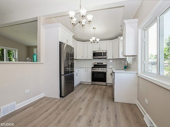 MOVE RIGHT IN!! Beautifully remodeled 3 bedrooms 1.1 bathrooms split level, situated on a CORNER LOT. All NEW: kitchen, bathrooms, SS appliances, light fixtures, luxury vinyl plank flooring in the living room, kitchen, family room and bathrooms, refinished floors throughout the bedrooms, hot water heater, garage door with opener, driveway and roof in 2022. This lovely home welcomes you into an open floor plan with vaulted ceilings and large windows which invites an abundance of natural light throughout entire first floor. Kitchen comes equipped with white shaker style cabinets, quarts counter tops, SS appliances, pantry, breakfast bar and eat-in area. Step down to the lower level with a large family room, bathroom and laundry room. Nicely landscaped with a pool and fence yard. Conveniently located by shopping, restaurants and expressway.