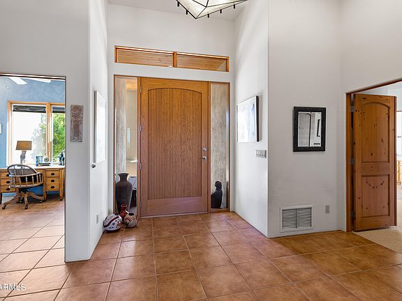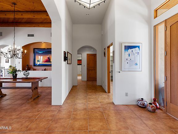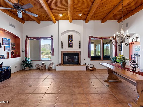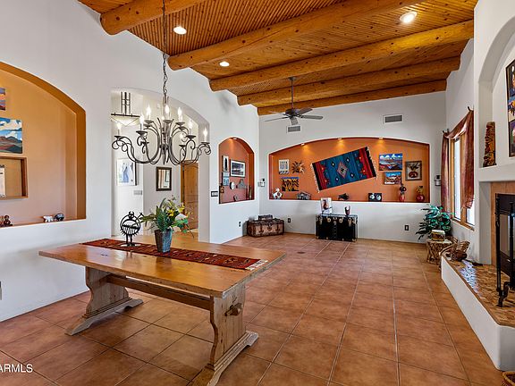 You will find some of the best views in the valley from this stunning custom one of a kind territorial home, nestled on a lush acre. This amazing home offers breathtaking Black Mountain views and a seamless open floorplan. From the moment that you walk through the beautiful courtyard gate you will know that this is a truly special home. The impressive entry welcomes you with a striking fireplace graced on both sides with captivating mountain views. The chef's kitchen features granite countertops, gas cooking and custom knotty alder cabinetry. The master suite, complete with a cozy beehive fireplace & private access to the pool and spa, offers a tranquil retreat. Viga & latilla tongue and groove 10 foot ceilings are just some of the special details in this home. The entertainer's backyard with a negative-edge pool, spa, built-in grill, and expansive patio with multiple seating areas makes this home perfect for enjoying Arizona sunsets and luxurious desert living.
