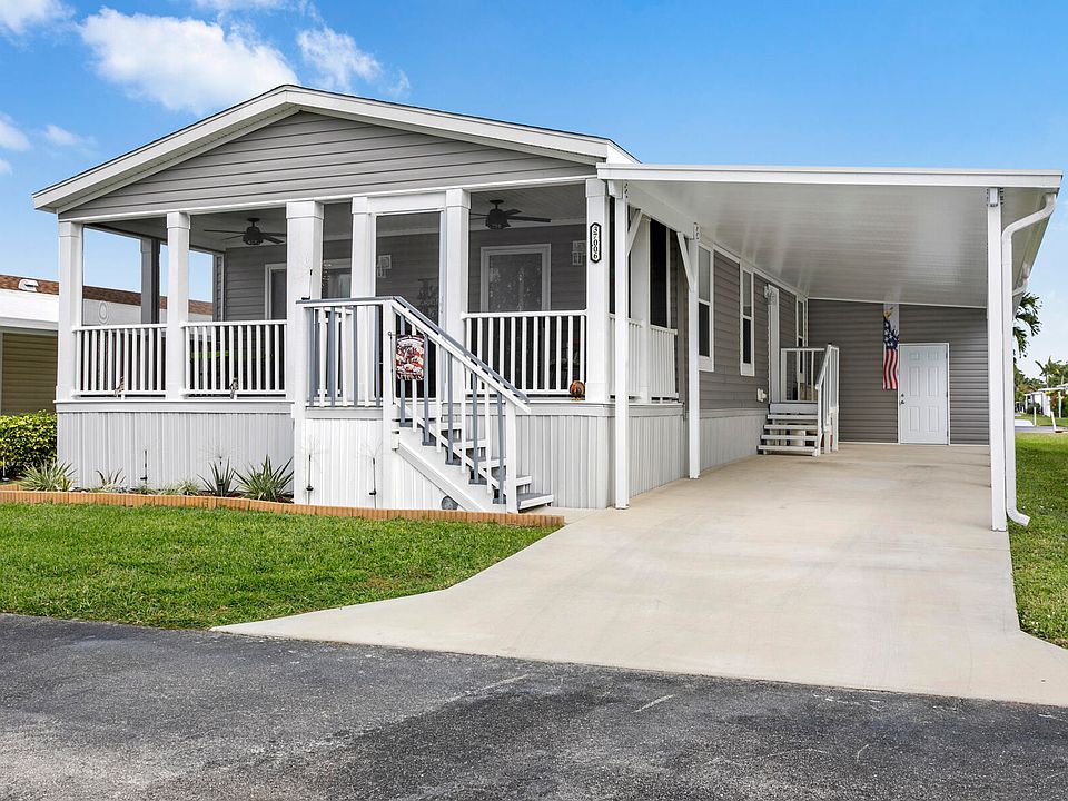 BRAND NEW 2024 Furnished Home in desirable 55+ Community. NO LAND LEASE. Low monthly fee. 24 Hour Manned Gated community with Heated Pools, Active Clubhouse, Library, Billiards, Bingo, Shuffleboard, Pickleball and more. Everything in this home less than 2 years old. Come and enjoy your screened Front Porch with picturesque views of the South Florida sunsets. Home features Kitchen with White Cabinets, Large Pantry, SS Appliances. Vinyl Flooring throughout. Dual Pane windows with drop down for easy cleaning, Open floor plan with plenty of natural lighting. Master Bedroom has walk in closet, Master Bathroom has dual sinks and step shower for easy access. Spacious Guest Bedroom and Guest Bathroom has step shower. Home is offered Completely furnished. New water Filtration system installed. Home is Rated Zone 3 up to 175 mile winds. Perfect location in the community. Walk to the Pool and Clubhouse.