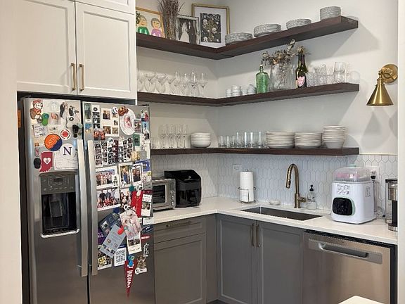 High-end finishesOversized islandLarge open kitchenOpen shelvingTons of cabinetsStainless steel appliancesBuilt-in microwave