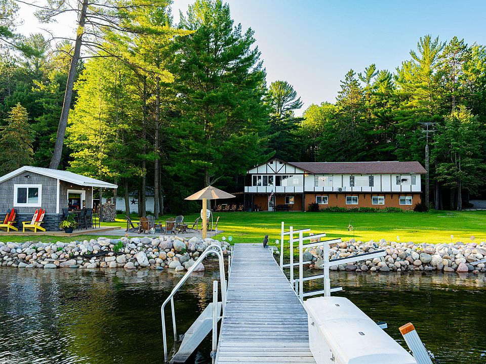 Growing pains on the lake?? Check out this 5 bed 4 bath home with walkout basement to 100 feet of frontage on all-sports East Twin Lake, within walking distance to downtown Lewiston. Paved driveway, attached 2-car heated garage and extra barn fill this sloping and spacious lot with nearly 2 acres. Brand new stamped concrete lakeside patio and bonfire pit, custom tiki bar, newer dock and fully irrigated yard with new pump. Newer septic drain field and newer boiler. Amazing lakeside views with all the large windows. Main level master-suite, laundry and office. Excellent value for this size home on the lake. Immediate possession so let your summer memories begin. Schedule a private tour today!!