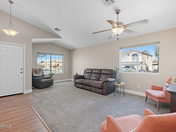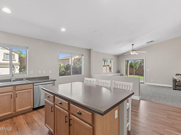 BRIGHT, FRESH & MOVE-IN READY! Nestled in the scenic foothills of the San Tan Mountains, this beautifully updated 3-bedroom, 2-bathroom home sits on a desirable corner lot in San Tan Heights. The kitchen shines with brand-new stainless steel appliances (2024), complemented by newer luxury vinyl plank flooring, carpet, & upgraded baseboards throughout. Stay comfortable year-round w/a new AC unit (2022), dual-pane windows w/solar screens, & ceiling fans in every room. Immaculate low-maintenance backyard features a covered patio, artificial turf, & watering system. Located just blocks from the 10,000+ acre San Tan Mountain Regional Park, offering miles of hiking, biking, & horseback trails, the Community features parks, playgrounds community center w/beach entry pool & splash pad.