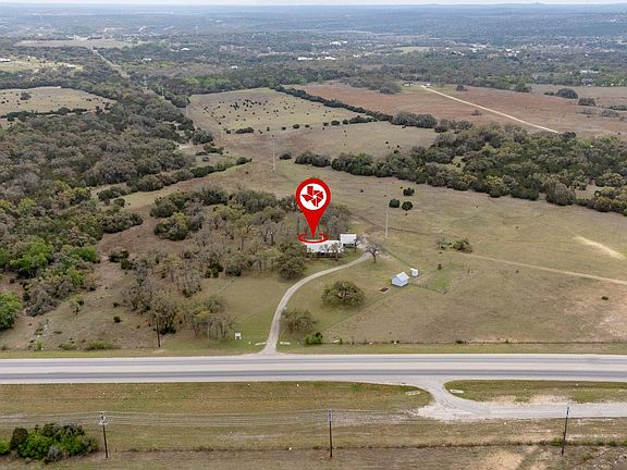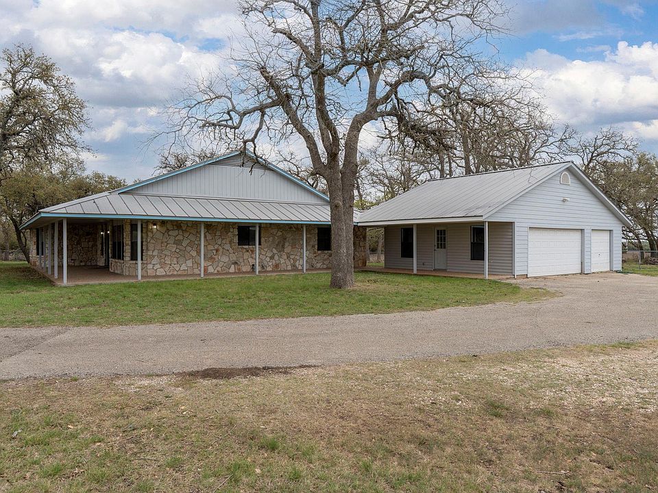 This ranch-style home is situated on 1.955 acres and located 4.3 miles west of RR 12 on Hwy 290. The single-story residence spans 2,152 square feet and includes 3 bedrooms and 3 full bathrooms, suitable for both residential and commercial purposes. The home features a wrap-around porch on two sides, an open floor plan with natural light from multiple windows, and fresh interior and exterior paint. New lighting fixtures, plumbing, and ceiling fans have been installed. The kitchen includes granite countertops, wood cabinetry, a center island, and recessed lighting. All appliances are included. The living room has a rock fireplace with a circulating fan. The primary bathroom contains a new jacuzzi tub, and the guest bedrooms have new carpeting. Hard tile flooring covers most areas. There is an enclosed rear patio porch providing additional living space. Outside features include a detached 3-car garage with a full bathroom, a storage shed, and a metal roof. The property is partially fenced and has Texas live oak trees. There are no deed restrictions, allowing flexibility for use as a home or business. This property offers an opportunity to own a piece of the Texas Hill Country.