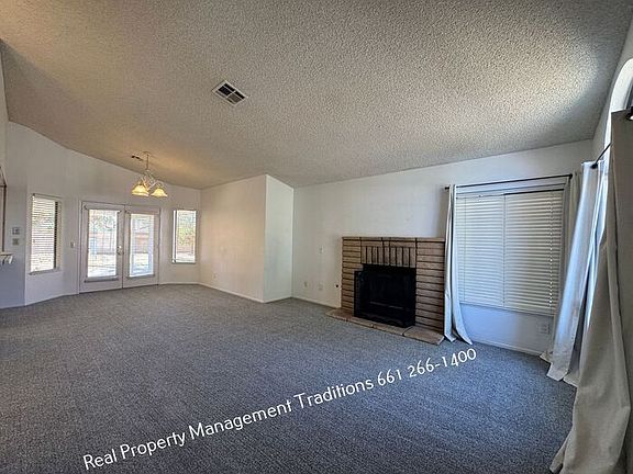 Cute 3 bedroom, 2 bath home located in East Palmdale. Cozy living room with fireplace, dining room with french doors to large covered patio area. Good sized kitchen with plenty of counter and cupboard space, breakfast bar, Indoor laundry; two car garage; large backyard with dog run; completely covered side area with double gates for additional parking/storage. Washer, dryer and refrigerator available.