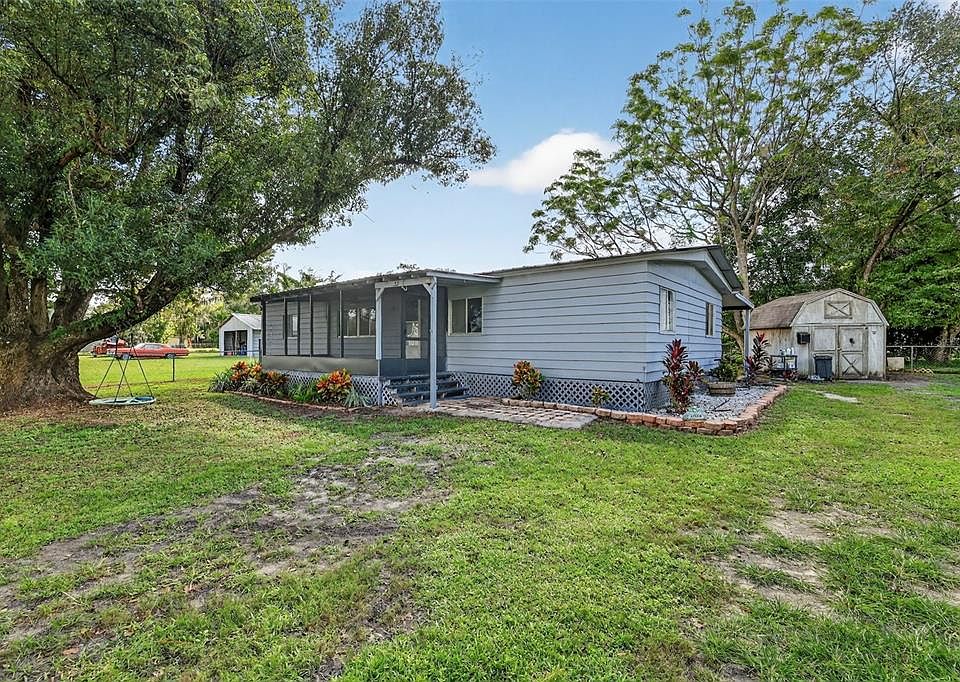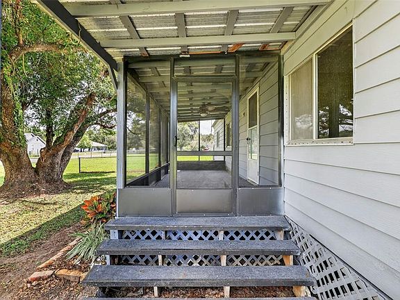 One or more photo(s) has been virtually staged. Welcome to a spacious and charming 3-bedroom, 2-bathroom home nestled on 1.08 fully fenced acres, offering a perfect blend of privacy, functionality, and rural tranquility. Step inside to discover a warm and inviting layout with multiple living areas, including a large family room, a bright living room with rustic wood accent walls, and a spacious kitchen featuring a large island, a separate coffee or wine bar, and ample cabinetry. The split-bedroom floor plan includes a generously sized primary suite with a large bathroom, while two additional bedrooms share a second full bath with updated finishes. Enjoy outdoor living year-round with three separate outdoor patios, including a screened front porch/sunroom, a covered back deck overlooking the expansive backyard, and a covered side patio for evening relaxation. The property also features two detached sheds, including a large 24' x 24' metal outbuilding ideal for a workshop, storage, garage, or even converting to additional usable living space. Surrounded by mature trees and open green space, the fenced-in yard is perfect for pets, play, gardening, or storing your toys. Conveniently located with easy access to town amenities, yet tucked away in a peaceful, country setting, this move-in-ready home offers a rare opportunity to enjoy real Florida living with room to spread out, be comfortable, yet secluded. Schedule your showing today to view this gorgeous property!